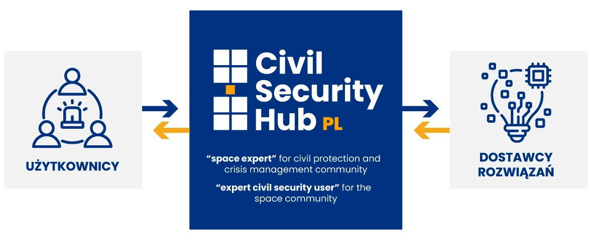 Civil Security Hub Poland działa na rzecz wdrażania innowacyjnych rozwiązań opartych na technikach satelitarnych na potrzeby ratownictwa, ochrony ludności i zarządzania kryzysowego. Hub łączy dostawców technologii z użytkownikami, umożliwiając testowanie, optymalizację oraz operacyjne wykorzystanie rozwiązań opartych na danych satelitarnych i dronowych. Jego ambicją jest dążenie do maksymalnie efektywnego wykorzystywania innowacji oraz przełamywanie barier organizacyjnych i technicznych. Civil Security Hub Poland jest częścią inicjatywy Europejskiej Agencji Kosmicznej pod nazwą Space Resilience Nodes.